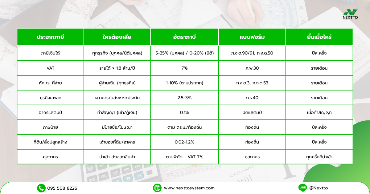 เจ้าของธุรกิจต้องรับผิดชอบภาษีหลายรูปแบบ ตั้งแต่ภาษีหลัก (ภาษีเงินได้, VAT, หัก ณ ที่จ่าย) ไปจนถึงภาษีเฉพาะ (ธุรกิจเฉพาะ, สรรพสามิต, ศุลกากร) และภาษีท้องถิ่น (ป้าย, ที่ดิน)
